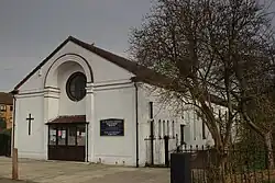 Dale's churches built after the Second World War were more ambitious. St. Michael and All Angels, New Marston (1954–56),[14] was built as a chapel of ease for St. Andrew's parish church, Headington.[13] It is more substantial in scale and has a statue of St. Michael by Michael Groser and a reredos painted by Leon Underwood.[15] St. Michael's is described as being in a "vaguely Italian renaissance style"[13] but the building is slightly limited by its corner site. Dale's final church, St. Swithun, Kennington (1956–58),[16] is in a spacious churchyard that allowed Dale the space to use a more spacious cruciform plan.