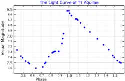The visual apparent magnitude of TT Aql ranges from 6.52 to 7.65 over 13.7546 days.[3] The light curve is asymmetric, with the rise from minimum to maximum brightness only taking half the time of the fall from maximum to minimum.[11]