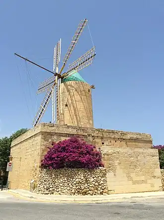 Like many other Maltese windmills, it has a round central tower surrounded by a number of rooms.[2] The sails and milling machinery have been restored, as have the miller's living-quarters. The museum also contains a large collection of traditional tools, mostly for wood- and iron-working.[4]: 221