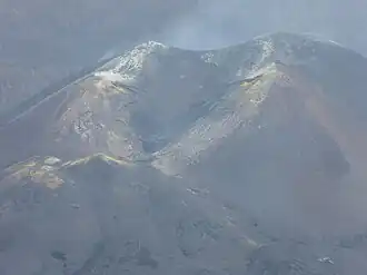 The volcano is 1,120 metres (3,670 ft) above sea level, with the cone of the volcano being approximately 200 metres (660 ft) high.[8][9] The main crater is 172 metres (564 ft) long and 106 metres (348 ft) wide, and is one of seven vents.[10] The Tajogaite eruption was associated with a magma-gas decoupled system, which resulted in 7-16% of the total erupted volume being made up of tephra.[11]