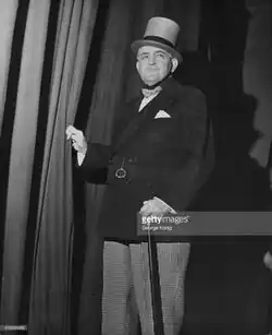 ![]() Talbot O'Farrell, ready to go on stage at the 1948 Royal Variety Performance, in his characteristic dress with top hat, cane, and monocle | |