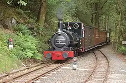 The engine was originally delivered as a 0-4-0ST with an open cab. Early tests on the railway showed that the short wheelbase led to unacceptable vertical oscillation, and in January 1867 Talyllyn was returned to its manufacturer and fitted with a pair of trailing wheels, converting it into an 0-4-2ST. Unusually, the trailing axle was fixed rigidly to the frame, resulting in an overall wheelbase of 8 ft (2.4 m). Most 0-4-2 locomotives have trailing wheels that can swivel independently of the frame to go around corners more easily. To accommodate the long wheelbase, the railway's gauge was increased marginally to between 2 ft 3.5 in (698 mm) and 2 ft 4 in (710 mm).[2] A cab was subsequently fitted in the railway's workshops at Pendre.[3]