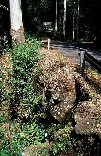 The Cedar Creek to North Tamborine section traverses very steep hillsides and deep gullies and retains its original alignment with a large "S" bend winding up the hill. As it has a steep gradient, the road has been made by cutting into the hillside and depositing the spoil down hill to make a wider road bed and ease construction problems. Where the cliff has been cut back, some rock walls have been built to stop the bank eroding onto the road and blocking it. Below the road dry stone rock walls, i.e. walls that have no mortar joining the stones, cover the steep embankments to prevent the road surface sliding downhill. To prevent the heavy rainfall washing the road away, culverts under the road direct the water away from the road surface. In some sections these original culverts were not adequate in very heavy rain.[4]