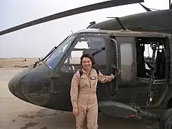 Duckworth was working toward a PhD in political science at Northern Illinois University, with research interests in the political economy and public health of southeast Asia, when she was deployed to Iraq in 2004.[32] She lost her right leg near the hip and her left leg below the knee[35] from injuries sustained on November 12, 2004, when the UH-60 Black Hawk helicopter she was co-piloting was hit by a rocket-propelled grenade fired by Iraqi insurgents.[36] She was the first American female double amputee from the Iraq War.[4] The explosion severely broke her right arm and tore tissue from it, necessitating major surgery to repair it. Duckworth received a Purple Heart[36] on December 3 and was promoted to the rank of major on December 21 at Walter Reed Army Medical Center,[37] where she was presented with an Air Medal and Army Commendation Medal.[36] She retired from the Illinois Army National Guard in October 2014 as a lieutenant colonel.[38]