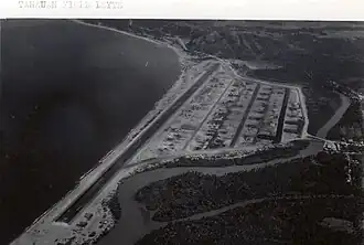 In a desperate move to have an operational airfield, Lieutenant General Krueger received permission from General Douglas MacArthur to construct an airfield in Tanauan. On November 28, 1944, the headquarters of the US Sixth Army was moved to Tolosa to start the construction of the airfield.[9] The airfield site covers an area bounded on the north, south and west by Embarcadero River, and on the east by San Pedro Bay. The site was favorably chosen due to its generally flat terrain, good sandy surface, and satisfactory drainage, and was also proven to be an excellent location for an airfield. In December 1944, the field became operational. By December 25, 1944, one runway with mat surfacing, one overrun, 90,000 square feet of warm-up area, 120,000 square feet of alert apron, one parallel taxiway, and 26 large dispersal areas were completed.[9] The control tower was code-named “Velvet Tower.”[11]