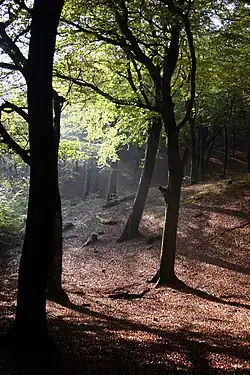 Tandle Hill was originally part of the township of Thornham – part of the extensive parish of Middleton. It was used as a meeting place for radicals in the 19th century. In the period leading up to the Peterloo massacre it was said that it had been used by radicals for practising marching and drilling. The beech woodland was planted to prevent this happening again and the hill became a hunting park and private game reserve as part of the Thornham Estate.[1] It was sold in 1861 and came into the ownership of Joseph Milne, whose wife later sold the park to Norris Bradbury, a Royton councillor. Bradbury gifted the park to the people of Royton in 1919 as a peace offering at the end of the First World War. A granite marker stands near the Oozewood entrance to the park, and its inscription reads: