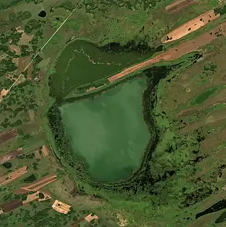 With an area of 87.8 square kilometers (33.9 sq mi) Tandovo is one of the largest lakes in Novosibirsk Oblast. It is located in the Baraba Lowland, the southern sector of the West Siberian Plain, 33 kilometers (21 mi) SW of Barabinsk. The lake lies 8 kilometers (5.0 mi) to the north of the northeastern end of Lake Chany, in the endorheic basin between the Ob and Irtysh rivers.[4] In the northern half of the lake, the 7 kilometers (4.3 mi) long and 0.5 kilometers (0.31 mi) wide Sugun Peninsula almost cuts Lake Tandovo in two.[1][5][6]