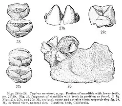 First discovered and described in 1921 by American vertebrate paleontologist Childs Frick, T. merriami lived at the same time, and perhaps many of the same locations, as T. californicus,[4] but is believed to have preferred more inland habitats of southern California and Arizona. Like T. californicus and all living tapirs, it is believed to have been a relatively solitary species. Of the four known Pleistocene-era tapirs found on the North American continent, T. merriami was the largest.[3] T. merriami was a stout-bodied herbivore with short legs, a large, tapering head, and a short, muscular proboscis adept at stripping leaves from shrubs.[5]