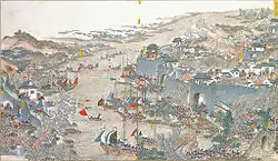In October, Taqibu and Luo Zenan attacked Tianjiazhen: Luo Zenan attacked Bangbishan, and Taqibu was in Fuchikou, separated by a small river. The two armies made a pontoon bridge to communicate with each other. The Taiping army fought with 10,000 men, Luo Zenan led Li Shubin to fight with them, and Taqibu fought against them across the harbor. The Taiping army also crossed the river from Tianjiazhen to attack the camp at Fuchikou, and was defeated by Taqibu.[7] Taqibu, Luo Zenan and other sailors planned to attack while Yang Zaifu and Peng Yulin division destroyed the Taiping army cross the river, but land forces from half of the mountain surged, and the two sides fought for a day and night, then the Taiping army abandoned the barricades and left, the Qing army attacked the Tianjiazhen. Taqibu was given a yellow waistcoat and the title of Cavalry Lieutenant.[7]