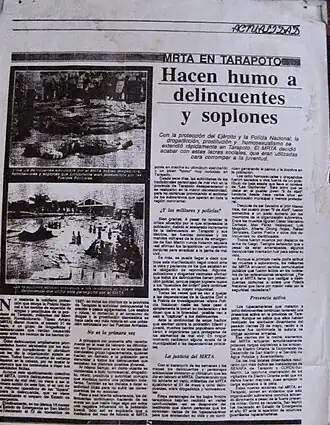 In the early morning of May 31, 1989, six members of the MRTA entered the discotheque Las Gardenias in the human settlement “9 de abril” because they had heard rumors that the place was operating as a clandestine gay bar. Indeed, there were homosexuals and transsexuals in the place, the subversives seized eight of the people present at random and took them to the outskirts of the bar to shoot them in front of the population.[2] The following day, in its weekly Cambio, the terrorist group justified its actions by affirming that the murdered people were delinquents and collaborators with the Peruvian army.[2]