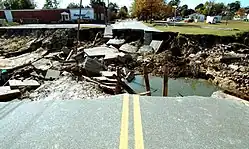 Flooding in Tarboro occurred mostly in areas around the Tar River, which exceeded 500-year flood levels along its lower stretches; it crested 24 ft (7.3 m) above flood stage. The Tar River surrounds about half of Tarboro as both the North end and Southern ends of the city have developed along it. Flooding began upstream in Rocky Mount, where up to 30% of the city was underwater for several days. In Tarboro, much of the downtown became flooded by several feet of water.[12] Nearby, the town of Princeville was largely destroyed when the waters of the Tar poured over the town's levee, covering the town with more than 20 ft (6.1 m) of floodwater for ten days.[13] Part of the Tarboro and Princeville city limits are defined by the Tar River.