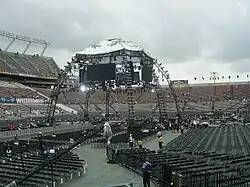 A tarpaulin being used to keep rain off a stage