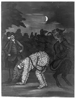 Tarring and feathering appeared in several English plays in the 1770s as a novel element used in "a satirical and comedic context". The appearance of a victim of the punishment was also used as a costume in a masked ball and other public appearances of that time.[47] Much later, in Meredith Willson's musical The Music Man (1957), tarring and feathering is demanded as punishment of the main character Harold Hill, con man and Trickster figure, for his scam.[59][60]