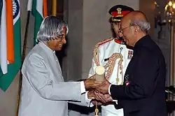 ![]() The President, Dr. A.P.J. Abdul Kalam presenting Padma Bhushan to Tarun Das (right), at investiture ceremony in New Delhi on 29 March 2006. | |