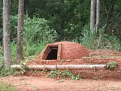 The word tatakua comes from the Guarani word "tatakua", literally, "fire hole" - from the nouns tata, "fire" and kua, "hole".[8][9][10] Originally, the Guarani people used the nests of a certain kind of ant (takuru), which used its excrement mixed with soil and saliva, resulting in solid and resistant nests, which could reach up to two and a half meters in height.[11][12][13]