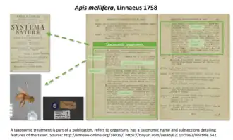 A taxonomic treatment is a section in a scientific publication documenting the features of a related group of organisms or taxa.[1] Treatments have been the building blocks of how data about taxa are provided, ever since the beginning of modern taxonomy by Linnaeus 1753 for plants[2] and 1758 for animals.[3] Each scientifically described taxon has at least one taxonomic treatment. In today’s publishing, a taxonomic treatment tag[4] is used to delimit such a section.[5] It allows to make this section findable, accessible, interoperable and reusable FAIR data. This is implemented in the Biodiversity Literature Repository, where upon deposition of the treatment a persistent DataCite digital object identifier (DOI) is minted. This includes metadata about the treatment, the source publication and other cited resources, such as figures cited in the treatment. This DOI allows a link from a taxonomic name usage to the respective scientific evidence provided by the author(s), both for human and machine consumption.