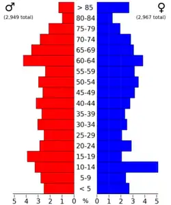 The age distribution was 23.90% under the age of 18, 7.50% from 18 to 24, 23.40% from 25 to 44, 22.80% from 45 to 64, and 22.40% 65 or older. The median age was 42 years. For every 100 females there were 94.10 males. For every 100 females age 18 and over, there were 92.00 males.