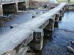 In the middle of the Republic of China, repaired into a stone pier wooden surface bridge. Early liberation of China, the bridge was washed away by the river, now only four stone piers, the rest were covered by the river bank sediment, stone pier part in 1973 to build the Enable Bridge with stone was demolished. Now the west bank pier is 4.2 meters high, 12.6 meters wide, and 9.7 meters long, complete preservation.[15]