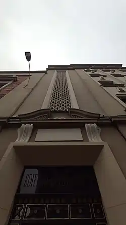 The external image, perfectly symmetrical, seeks to mask the internal diversity. The openings that correspond to the theater adopt domestic forms that functionally may be inappropriate, in favor of an assimilation of the openings that serve residential or tertiary uses. Based on this criterion, the architectural style used is the most common at the time, imperial neo-historicism, characterized by being symmetrical, severe, well-proportioned and moderately ornamented in singular points.[4]