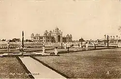 The plan of the High Court was drawn up by Shankar Lal of Jaipur and the local engineer who executed the design was Mehar Ali Fazil. Its chief engineer was Nawab Khan Bahadur Mirza Akbar Baig. The High Court was built on the ruins of the Qutb Shahi palaces, Hina Mahal and Nadi Mahal.[7] The construction started on 15 April 1915 and was completed on 31 March 1919. On 20 April 1920, the high court building was inaugurated by the seventh Nizam Mir Osman Ali Khan.