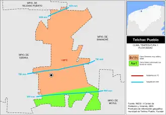 In Telchac Pueblo there are two kind of climate, in the extreme south the climate is classified as Warm humid with rains in summer, less humid, and the rest of the municipality is Semidry warm and very warm;[7] annual average temperature recorded is greater than 26 °C;[8] Average annual precipitation increases from north to south, ergo, away from the coast in successive bands, the first from 500 to 600 mm, second from 600 to 700 mm, third from 700 to 800 mm and the last from 800 to 1,000 mm.[9]