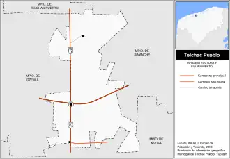 The main road is the 172 state-owned, This road connects in north with Telchac Puerto, in south with the city of Motul where it connects with 176 federal highway; the second state-owned road connects in west with Dzemul and Baca, in east with Sinanché, Yobaín and Dzidzantún where it connects with 178 federal highway. There is also at the southern end of the municipality a secondary road from road 172 that communicates with the village of Uci, which belongs to the neighboring city of Motul.