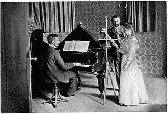 In 1901, the Telefon Hírmondó employed about 180 people during winter and 150 in the summer.[5] The staff consisted of a business manager, an editor-in-chief, four assistant editors, and nine reporters. The only ladies among the staff were those who sang in the concerts. At this time the service employed six stentors in the winter: four for duty, and two for alternates. Due to the effort required to speak loudly into the transmitters, readers took turns of ten minutes each. The stentors had strong and clear voices with distinct articulation to maintain clarity of sound over the telephone lines. In the summer, four stentors sufficed. In cases where only two stentors were on duty, they took turns of half an hour maximum.[5] By 1907, the system had a staff of over two hundred people, including two business managers, two principal editors, six sub-editors, twelve reporters, and eight stentors.[13]