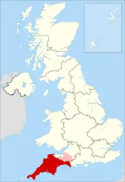 Cornwall, Devon, Isles of Scilly, southern and western Somerset, western Dorset