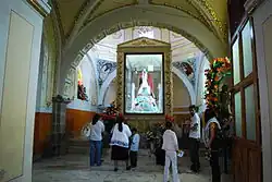 The main church or the Sanctuary of Señor Santiago is just north of the plaza. The main nave of the church was begun in the 16th century by the Franciscans who came to evangelize the area.[6][7] The church suffered a fire at the end of the 16th century.[4] The main feature of the church is a very large equestrian sculpture of Saint James the Moor-slayer, which is the only one of its kind in Latin America, due to its size and age. It was carved by indigenous carvers in the early colonial period and has pre-Hispanic elements.[2] Because of the importance of this image and the pilgrims it attracts, the church received the title of “sanctuary” in 1986[7] This church is the main one for the municipality, complemented by smaller ones in communities such as San Pedro Arriba, La Magdalena Tenexpan, San Diego Alcalá and San Lorenzo Oyamel.[2] The lienzo charro or charreada ring is the property of the Asociacion de Charros de Temoaya. It was constructed between 1982 and 1996. The major event to take place here is the annual commemoration of the Day of the Charro on 14 September. In addition to charreada, the ring also hosts events such as lucha libre, boxing and political events[8]