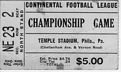 The Continental Football League Philadelphia Bulldogs played their home games at Temple Stadium during their two seasons in the league. The club won the 1966 league title. On December 4, 1966, the Bulldogs defeated the Orlando Panthers, 20–17 in overtime in front of 5,226 at Temple Stadium for the CFL Championship.[16] The club disbanded in May 1967.