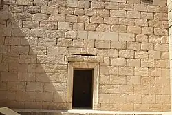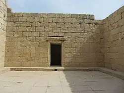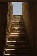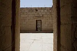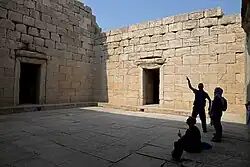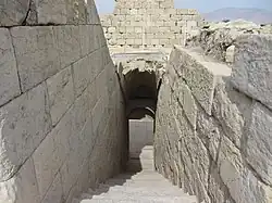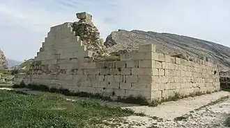 The Temple of Anahita is a large rectangular room in the shape of a cube in a depression 6 meters above the ground, each side of which is nearly 14 meters. It is built of carved stones without mortar, double-walled, and in the Achaemenid architectural style. These stones are connected to each other with iron fasteners. A staircase from the palace was also connected to this temple. The temple has no roof and the purpose was to bring the water of the Shapur River, which flows 250 meters away, into the temple, so that after flowing inside the temple, it would be discharged through a Qanat.[8][9]