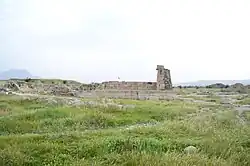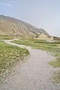 The Temple of Anahita is located near the Royal palace of Shapur I and adjacent to the Iwan-e Mosaic and Ceremonial Hall in the northeast of the ancient city of Bishapur, one of the capitals of the Sasanian Empire, 15 kilometers west of the city of Kazerun.[2]