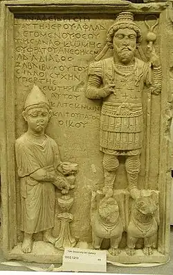 The most important and revealing artifact found in the Temple is a limestone stele dedicated to Aphlad. It is a rectangular relief standing about 51cm tall and 32cm wide, with a depth of about 9cm.[6] It depicts Aphlad in military garb standing atop two griffins with a scepter in hand. Beside him a priest offers incense[1] atop an altar. Also on the stele is a Greek inscription reading:
