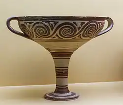 The classical temple of Athena Pallenis was preceded by an archaic temple, which existed at the time of Pisistratus' final seizure of power in 546 BC.[6] An isolated poros triglyph dating to around 650 BC, which was found near the church of St. George in 1927, may derive from this temple.[2] Seventh-century BC figurines that were deposited in the Classical temple's foundations probably also come from the Archaic sanctuary.[6] This archaic templemay have been located to the northeast of the Classical foundations.[2]