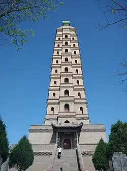 The eleven story, 53.9-metre (177 ft) tall, dodecagon-based, Haibao Pagoda (海宝塔) is made of brick and stone, also known as the Northern Pagoda (北塔). It is built on a square brick base, each side measuring 19.7 metres (65 ft) long and 5.7 metres (19 ft) high. It is composed of a pagoda base, a dense-eave body, and a thatsa.[2][7][8]