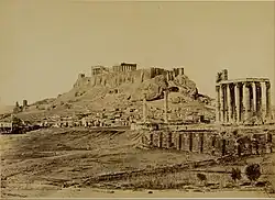 This photograph of 1865 by Constantinou Dimitrios shows above the last two columns of the main group, a small stone structure in which had lived an ascetic or Stylite