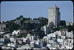 After Dan London became the manager of the St. Francis in 1937, he, Crocker, and Crocker's nephew decided to hire brilliant San Francisco architect Timothy Pflueger to turn the existing ground-level restaurant into a sleek and curvaceous Art Deco lounge. The resulting "Patent Leather Room" was unveiled in 1939, with furniture finished in patent leather; however, the press and public dubbed it "Coffin Corner" or "The Black Hole".[33] Ansel Adams was hired to take publicity shots.[34] The Crockers sold their interest in the St. Francis in 1944 to a group led by Benjamin Swig[35] and the Patent Leather Room was replaced by the "Terrace Room" in 1953.[36]