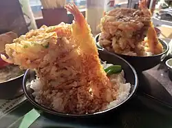 Tempura is also used in combination with other foods. When served over soba (buckwheat noodles), it is called tempura soba[18] or tensoba. Tempura is also served as a donburi dish where tempura shrimp and vegetables are served over steamed rice in a bowl (tendon) and on top of udon soup (tempura udon).
