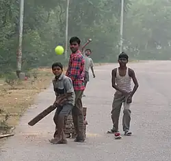 The rules of this game can vary significantly from standard cricket, and often the rules of regular cricket do not apply as they normally would. The number of overs in a game and players in a team is usually less than in a conventional cricket match. Considering that the ball is not as hard as a professional cricket ball, the use of protective gear like gloves, pads and helmets is optional. The playground can be anywhere from a house backyard to a beach to a relatively-uncrowded street, the courtyard of a school, the driveway of a residential building, agricultural fields or any open public spaces with shorter user defined boundaries and make shift stumps.[4] In the Middle East, it is played in the open desert and baseball or soccer grounds are used in the US, Canada and Europe.[5]
