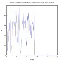 - If μ equals 2 the system maps the interval [0, 1] onto itself. There are now periodic points with every orbit length within this interval, as well as non-periodic points. The periodic points are dense in [0, 1], so the map has become chaotic. In fact, the dynamics will be non-periodic if and only if is irrational. This can be seen by noting what the map does when is expressed in binary notation: It shifts the binary point one place to the right; then, if what appears to the left of the binary point is a "one" it changes all ones to zeroes and vice versa (with the exception of the final bit "one" in the case of a finite binary expansion); starting from an irrational number, this process goes on forever without repeating itself. The invariant measure for x is the uniform density over the unit interval.[2] The autocorrelation function for a sufficiently long sequence {} will show zero autocorrelation at all non-zero lags.[3] Thus cannot be distinguished from white noise using the autocorrelation function. Note that the r = 4 case of the logistic map and the case of the tent map are homeomorphic to each other: Denoting the logistically evolving variable as , the homeomorphism is