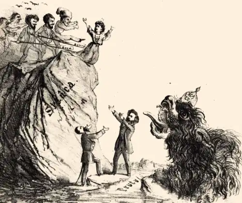 At the time, the United Principalities had a "Red" cabinet headed by Constantin A. Kretzulescu, who was able to caucus among the Moldavian autonomists. One of the latter, Alecu D. Holban, canvassed for additional support at Iași. Boldur-Lățescu intervened to announce that Moldavians were being "cheated" out of their remaining local rights, but found himself heckled.[69] During summer 1867, Boldur-Lățescu experimented with satirical writing, putting out the short-lived humorous paper, Boldul ("The Pin"). This made use of provocative cartoons and lithographs, such as depicting the aurochs of Moldavia and a female figure representing the principality, both being pecked by crows; to these were added drawings which personally attacked Carol. They earned Boldur-Lățescu negative attention from Wallachian and monarchist soldiers stationed in Iași.[70] Moldova, meanwhile, entered a polemic with the Wallachian leftist C. A. Rosetti and his Românul gazette. In June, Moldova claimed that Rosetti had pocketed 20,000 ducats from funds meant to ensure Cuza's toppling. Românul responded that the claim was pure libel, and that the 1866 conspirators had only ever had 5,000 ducats between them.[71] It then returned with allegations of its own, namely that Moldova was a front for Rosnovanu's interests.[63]