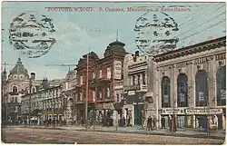 The Ter-Abramyan House was built in 1886. It was designed by famous Rostov architect Nikolay Matveyevich Sokolov. Dwellings in the building were rented. Ter-Abramyan printing-office worked at the ground floor. It issued books, calendars, newspapers and other. Along with the printing-office Donskaya pchela (Russian: Донская пчела, literally Don bee) newspaper editorial office worked.[3] Also shops and photo studios, where worked photographers: Isakovich, G. A. Shifrin, B. P. Mishchenko, occupied the ground floor. Vechrneye vremya (Russian: Вечернее время, literally Evening time) newspaper editorial office was located in the Ter-Abramyan House in 1918.[4]