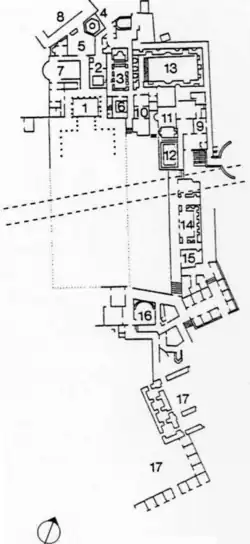The republican baths were entered through an atrium with a mosaic floor depicting stars and diamonds. This led to the large exedra (semicircular hall) (7) probably for changing and exercise, with the "small exedra" adjacent to it. The oldest room of the baths was the adjacent domed round bath (4) of the 2nd century BC originally fed by hot spring water. Under Hadrian the bath was converted into a laconicum or sudatorium (dry heat bath) by supporting a new marble floor on brick columns for heating from below.[14]