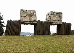 Terra Incognita, designed by Ilan Averbuch, was installed at North Broadway and North Larrabee Avenue, at the foot of the Broadway Bridge, in Portland's Rose Quarter in 1995. The gate-like sculpture is made from steel, wood, stone and copper, and measures 15 feet (4.6 m) x 40 feet (12 m) x 6 feet (1.8 m).[1][2] It forms five cubes in a "strong positive negative pattern".[2] The three base cubes are bundled tree trunks, and the two cubes suspended by the lower three are stone piles. According to the Regional Arts & Culture Council, which administer the sculpture: