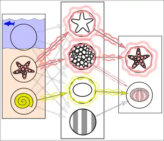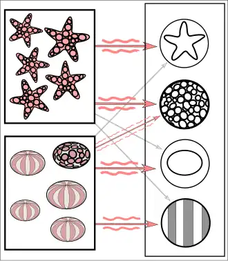 Subsequent run of the network on an input image (left):[8] The network correctly detects the starfish. However, the weakly weighted association between ringed texture and sea urchin also confers a weak signal to the latter from one of two intermediate nodes. In addition, a shell that was not included in the training gives a weak signal for the oval shape, also resulting in a weak signal for the sea urchin output. These weak signals may result in a false positive result for sea urchin.