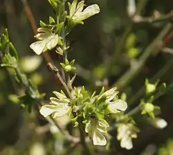 Teucrium teucriiflorum is a semiscandent shrub with many branches that typically grows to a height of up to 1.5 m (4 ft 11 in), often with very few leaves. The leaves are arranged in opposite pairs, linear to narrow lance-shaped or narrow egg-shaped, 5–25 mm (0.20–0.98 in) long, 1–4 mm (0.039–0.157 in) wide and sessile. The flowers are mostly arranged singly or in groups of up to three in upper leaf axils, each flower on a pedicel 3–5 mm (0.12–0.20 in) long with leaf-like, linear to lance-shaped bracts 3–7 mm (0.12–0.28 in) long. The five sepals are 4–7 mm (0.16–0.28 in) long and joined at the base. The petals are creamy-white, 8–11 mm (0.31–0.43 in) long with five lobes, the lower middle lobe 5–7 mm (0.20–0.28 in) long. Flowering occurs in most months but mainly from August to November.[2][3][4]