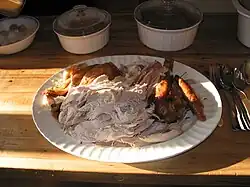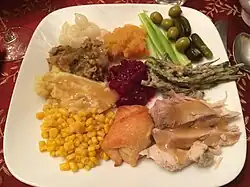 Along with attending church services, Thanksgiving dinner remained a central part of celebrations from the holiday's early establishment in North America.[4] Given that days of thanksgiving revolve around giving thanks, the saying of grace before Thanksgiving dinner is a traditional feature of the feast.[5] At Thanksgiving dinner, turkey is served with a variety of side dishes that can vary from traditional[6] to ones that reflect regional or cultural heritage.[7]