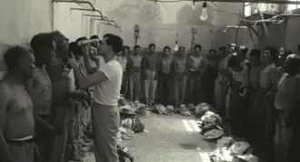 An official examines a bracero's teeth and mouth with a flashlight Monterrey Processing Center, Mexico