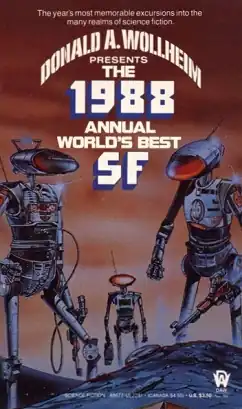 The 1988 Annual World's Best SF is an anthology of science fiction short stories edited by Donald A. Wollheim and Arthur W. Saha, the seventeenth volume in a series of nineteen. It was first published in paperback by DAW Books in June 1988, followed by a hardcover edition issued in August of the same year by the same publisher as a selection of the Science Fiction Book Club. For the hardcover edition the original cover art by Blair Wilkins was replaced by a new cover painting by Richard Powers.