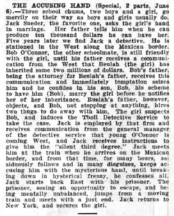 As described in Moving Picture World: three school chums, two boys and a girl, go merrily on their way as boys and girls usually do. Jack Sneder, the favorite one, asks the girl's hand in marriage. Her father tells him when he can produce ten thousand dollars he can have her. Five years later we find Jack a detective. He is stationed in the West along the Mexican border. Bob O'Connor, the other schoolmate, is still friendly with the girl, until his father receives a communication from the West that Beulah (the girl) has inherited some two millions of dollars. Bob's father, being the attorney for Beulah's father, receives this communication and immediately temptation seizes him and he confides in his son his scheme to have him (Bob), marry the girl before he notifies her of her inheritance. Beulah's father, however, objects, and Bob, not stopping at anything, hires two thugs to do away with him. The girl suspects Bob and induces the Tuell Detective Service to take the case. Jack is employed by that firm and receives communication from the general manager of the detective service that young O'Connor is coming West, and Jack receives instructions to give him the "silent third degree." Jack meets him at the train when he arrives on the Mexican border and from that time, tor many hours, assiduously follows and in many disguises, keeps accusing him with the mysterious hand, until breaking down in hysterical frenzy, he confesses all. Jack starts back East with his prisoner. The prisoner, seeing an opportunity to escape, and being mentally unbalanced, jumps from a moving train and meets with a just end. Jack returns to New York, and secures the girl.